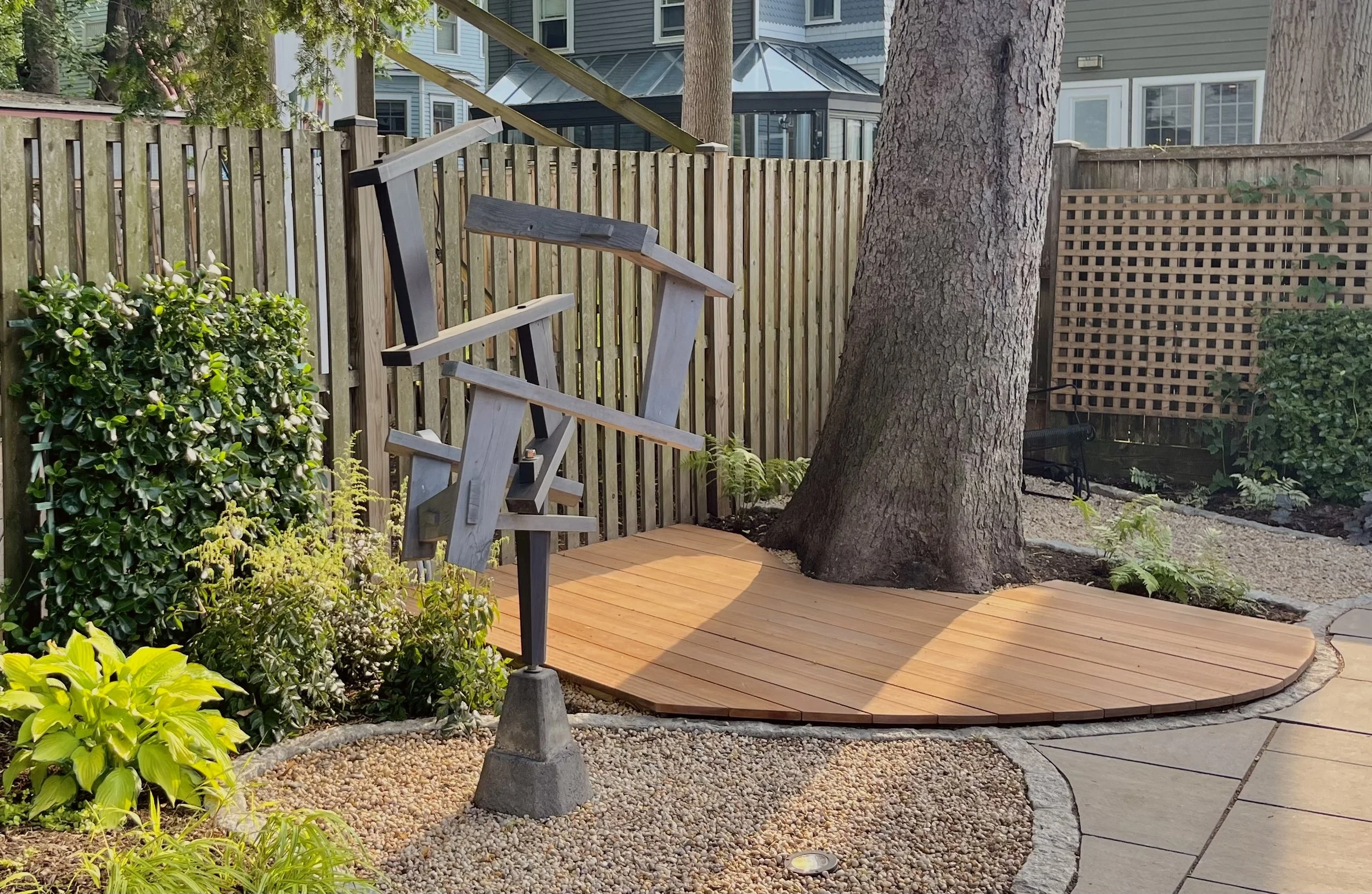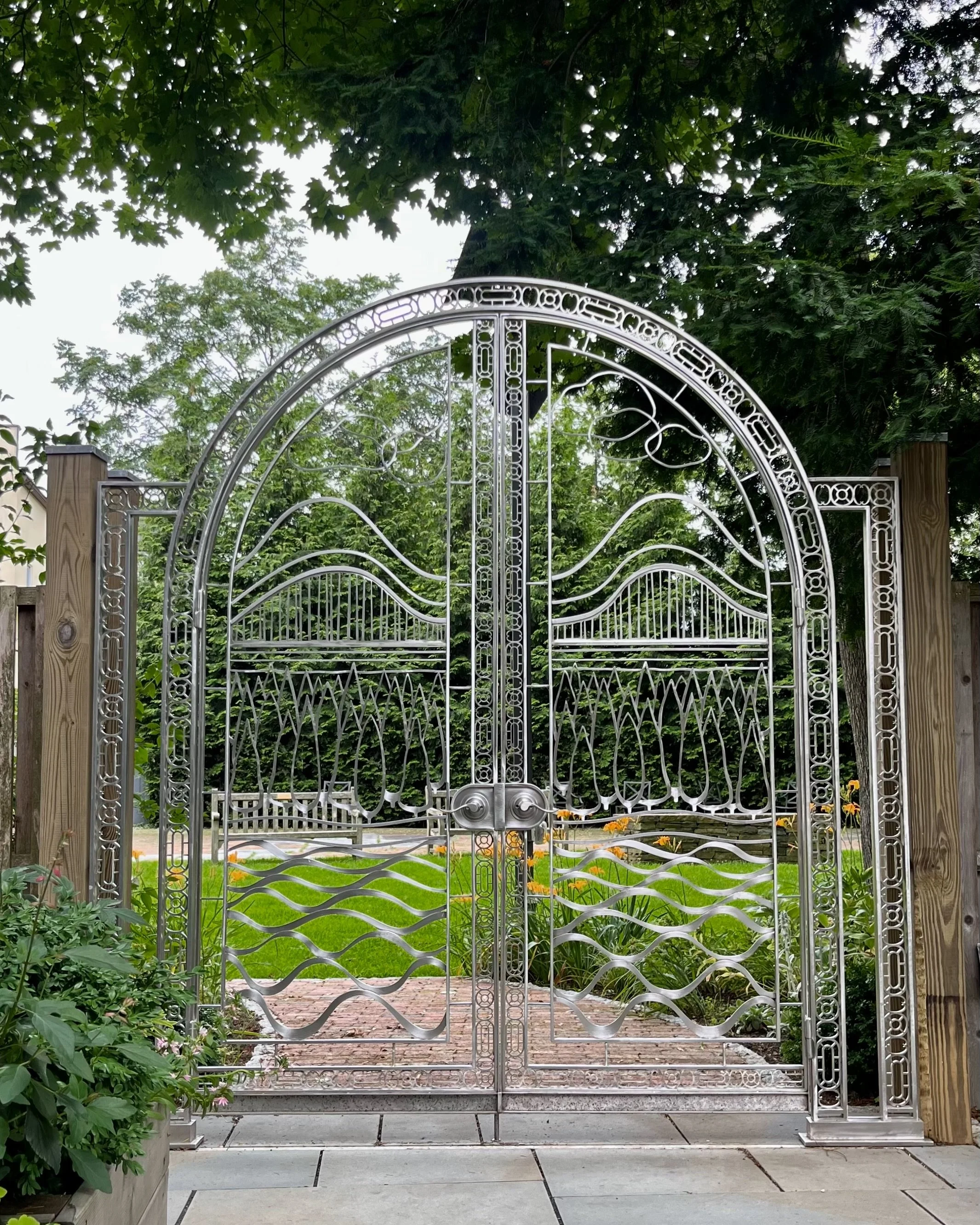 Entry to the courtyard via an outdoor path, featuring a stainless steel gate created by sculptor Eric Laxman.