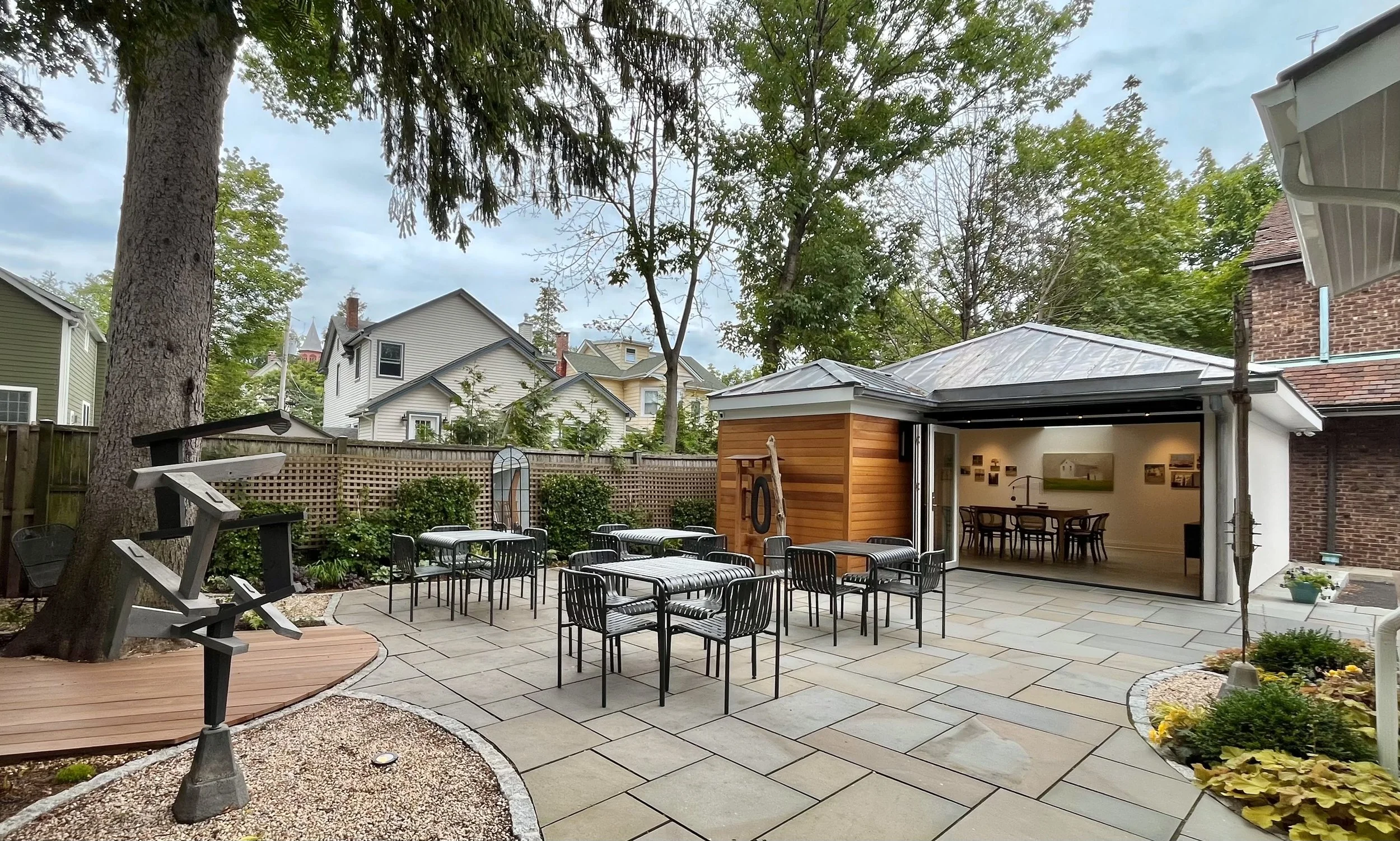An indoor/outdoor gathering space, designed by Aurell Garcia Architects and constructed by Fox Fine Carpentry, featuring glass doors opening to a blue slate courtyard, allowing for various configurations of tables and tents.